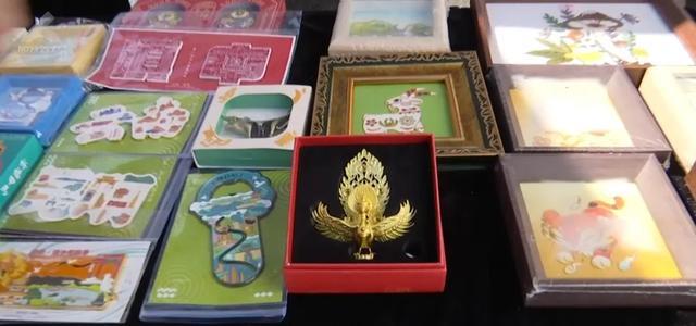 商户:“文创有我们非遗老师做的一些文创的冰箱贴,像这个甲马冰箱贴就是非遗老师根据我们非遗的一些东西做出来的。这个是我们省博物馆里的(大鹏金翅鸟),也是复刻出来的,像这个(野生菌画框)也是我们非遗老师手工刺绣出来的。”