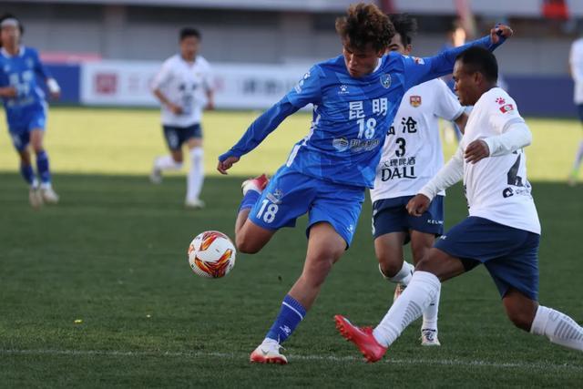 本场比赛,昆明队的队长、中场核心沈辑星因伤缺席。比赛开始后,掌握主场优势的昆明队并未着急进攻,而是通过耐心的传导寻找机会。在比赛第9分钟,昆明队在临沧队禁区前成功抢断后送出一记直传,41号李浩文心领神会,抢在临沧队门将出击前铲射破门,昆明队1比0领先。