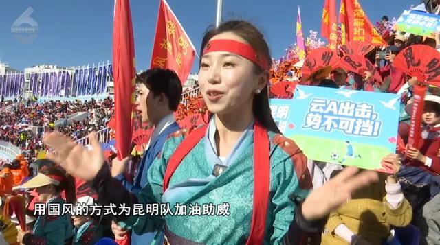 现场球迷:“我们演员身穿古代的蹴鞠服,很多人还穿了汉服,我们这个方阵有别于其他方阵,用国风的方式为昆明队加油助威。”
