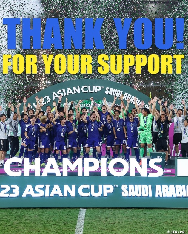 日本足协官方写道:2026年沙特U23亚洲杯冠军,我们成为该项赛事首支卫冕成功的队伍,感谢大家对日本U23队的支持,球员们将继续成长,为两年后的奥运会做准备,感谢大家一直以来的支持。